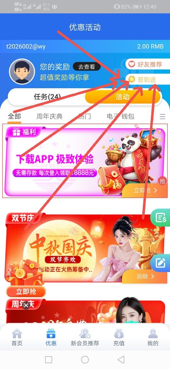 优惠→点击签到送 自助领取即可