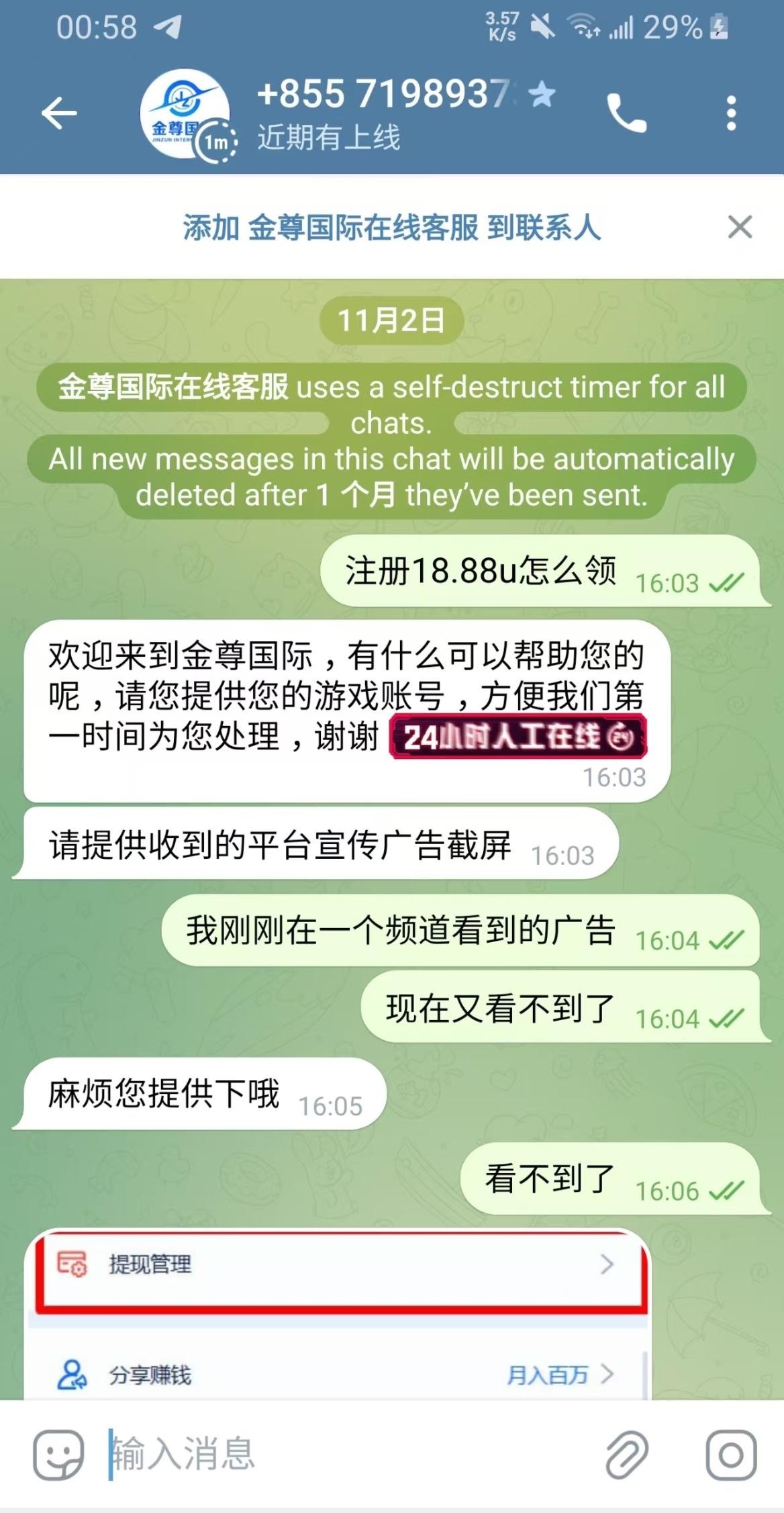 有汇旺的去,绑定手机号和汇旺,汇旺不需要流水。联系飞机客服@JinZunKF 申请。审核通过了会给你一个兑换码。就说在一个频道看到的广告,但是现在看不到了。我领到了没有打出来,请勿充值