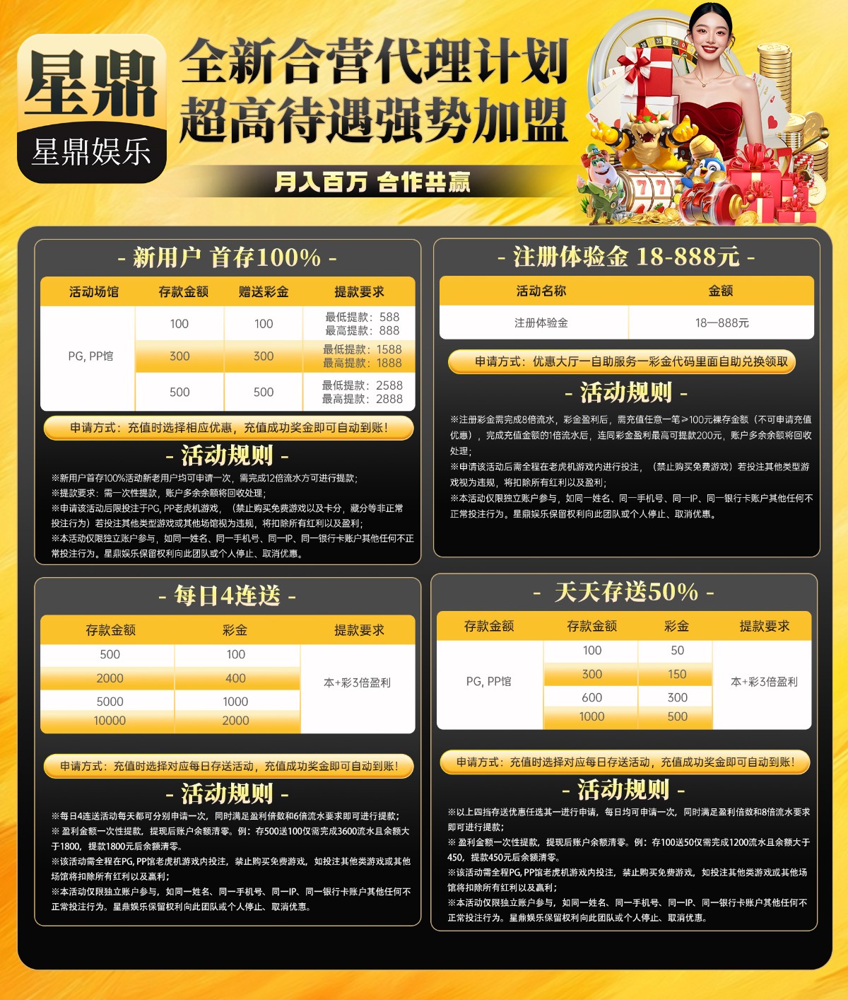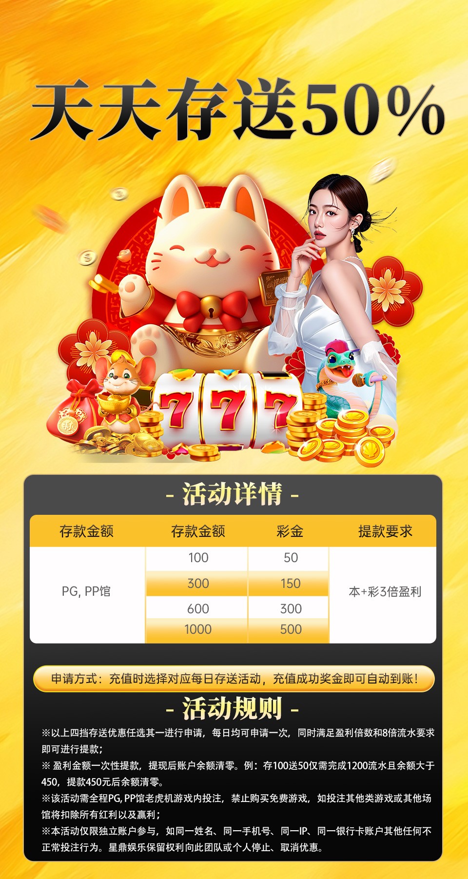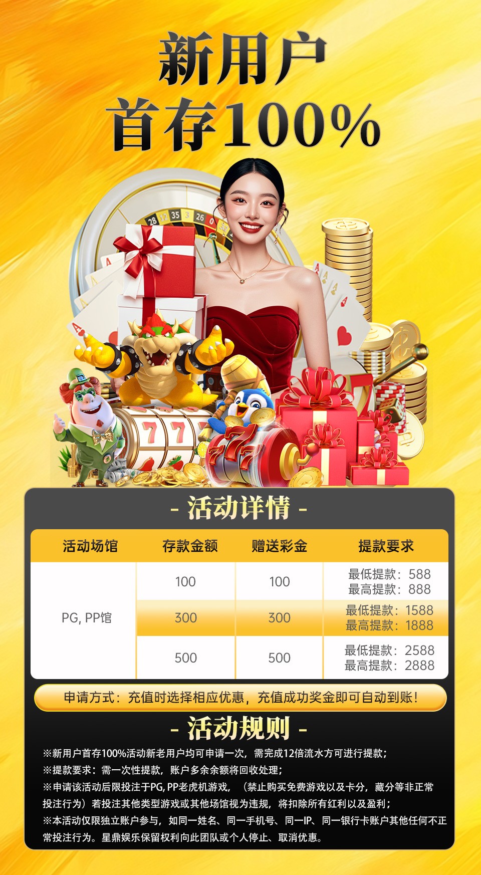 首存活动:100+100/300+300/500+500,规则看图片。