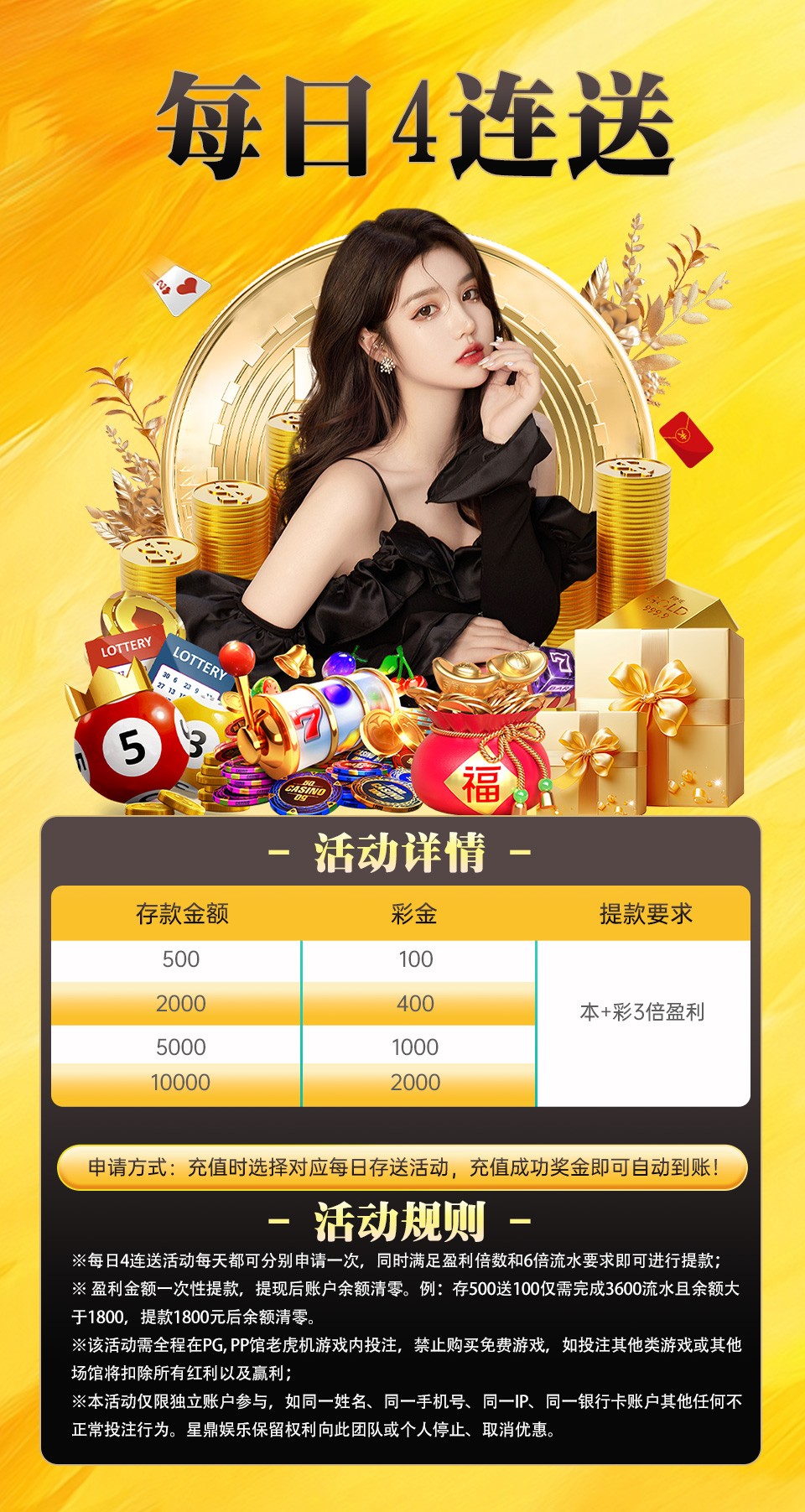 2、该活动需在投注前绑定银行卡,代码提款仅能提至绑定的银行卡,且提现前不能修改;