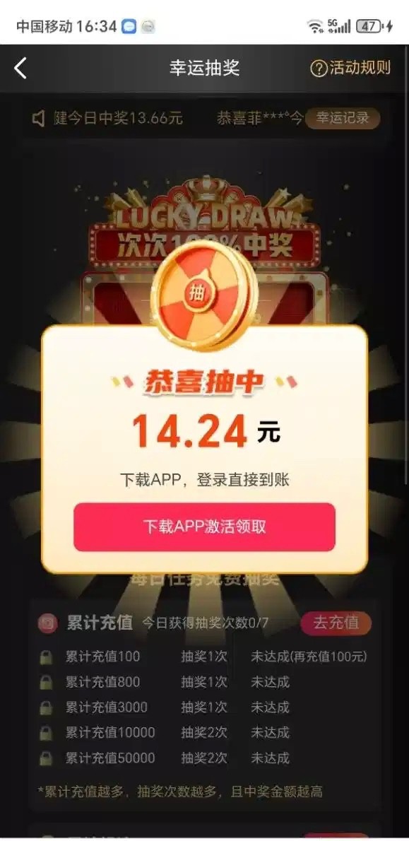 注册首页幸运抽奖,抽到下载app领取1倍有效投注才可提现,投注不限游戏;