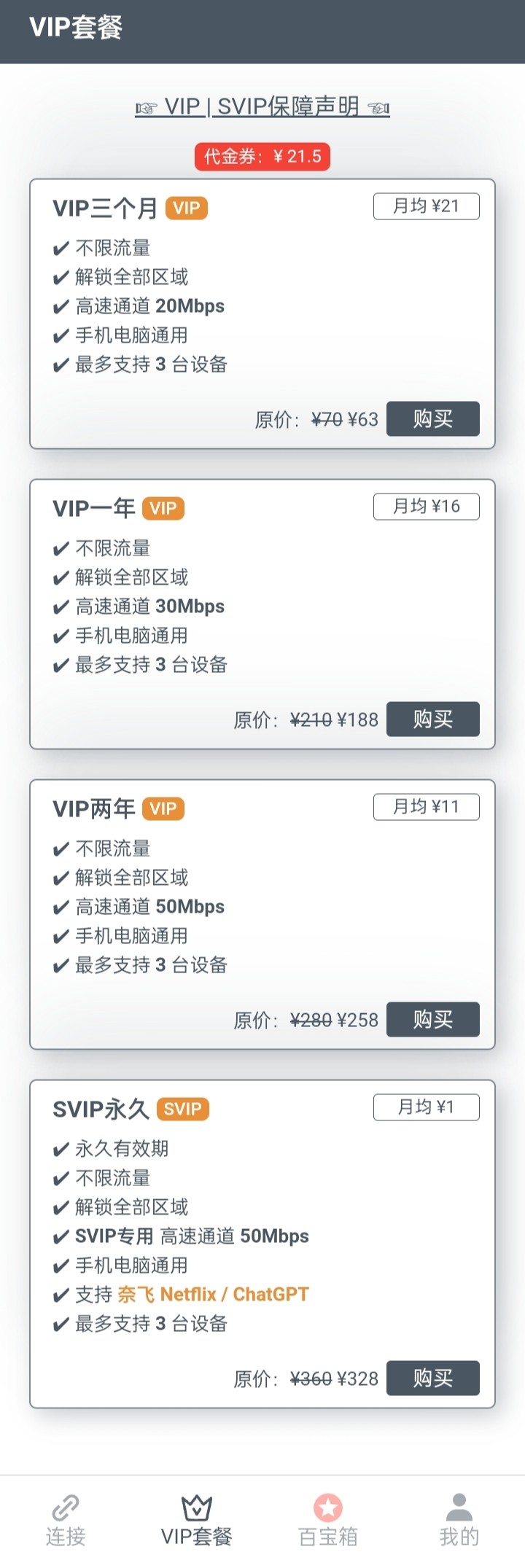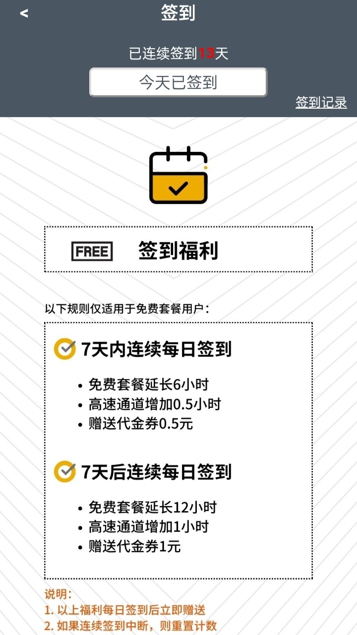 新用户刚注册可以免费获得30天每日签到可以获得免费时长+代金卷(积攒足够多了可以用来购买VIP)网址点击进入