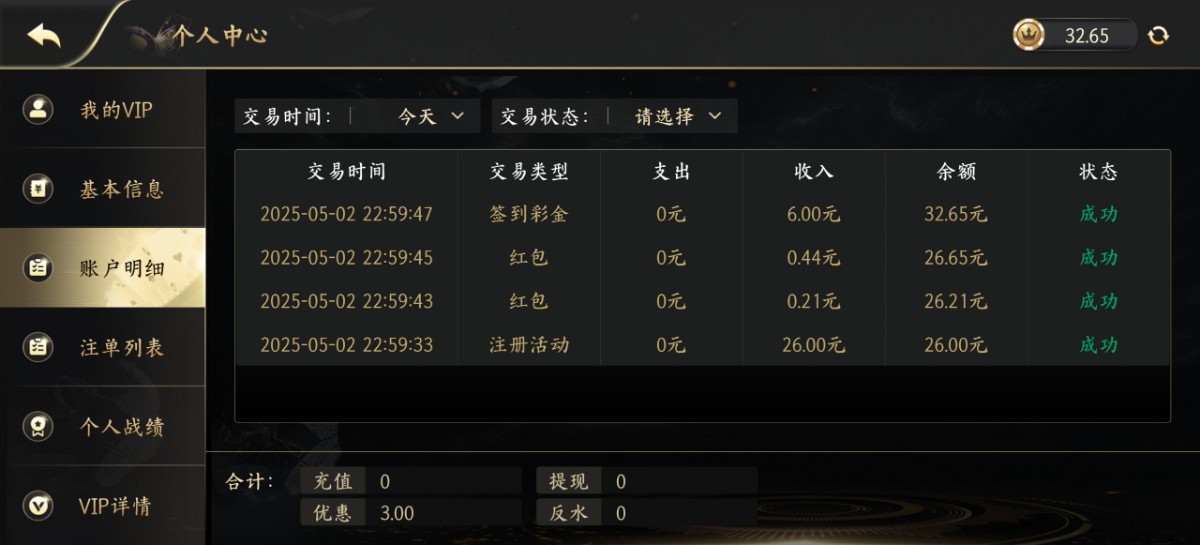 三个台子都送30以上,优惠里自助申请+签到游戏限制5杯水,最低最高出款100。彩金首次出款只限当地注册的银行卡。充值提款可用钱包不限制出款条件。