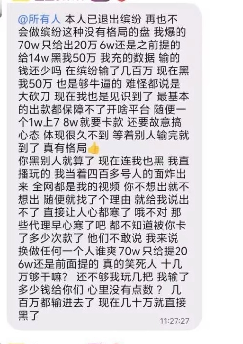 缤纷系列多美台专黑大额,去年我也是2000↑7万,提现只给出2w黑5万,去年两个月少说充了也有20多个了,两三天一个新台,后面有一个台好不容易2000↑7W,只给出2万,笑死了,亏我之前一有钱就玩,总共陪伴了三年多,说黑就黑